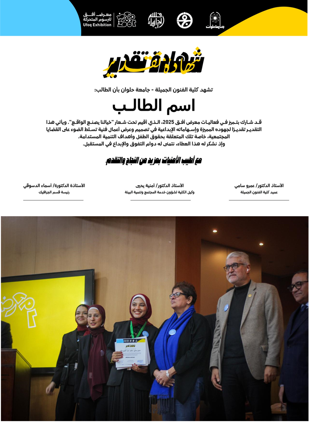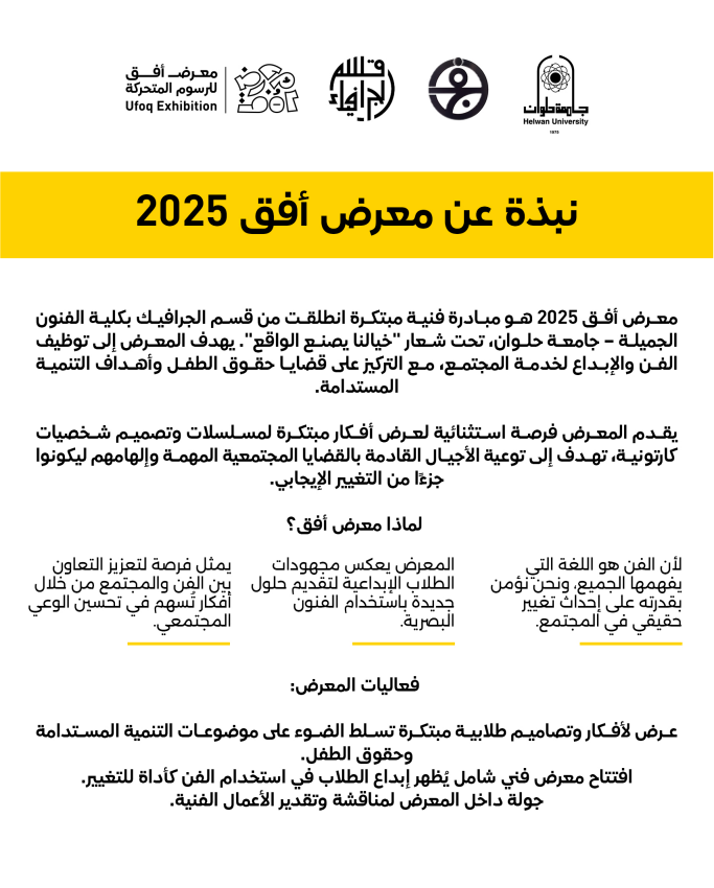 معرض أفق ٢٠٢٥ هو مبادرة فنية مبتكرة انطلقت من قسم الجرافيك بكلية الفنون الجميلة - جامعة حلوان، تحت شعار "خيالنا يصنع الواقع" يهدف المعرض إلى توظيف الفن والإبداع لخدمة المجتمع، مع التركيز على قضايا حقوق الطفل وأهداف التنمية المستدامة.
