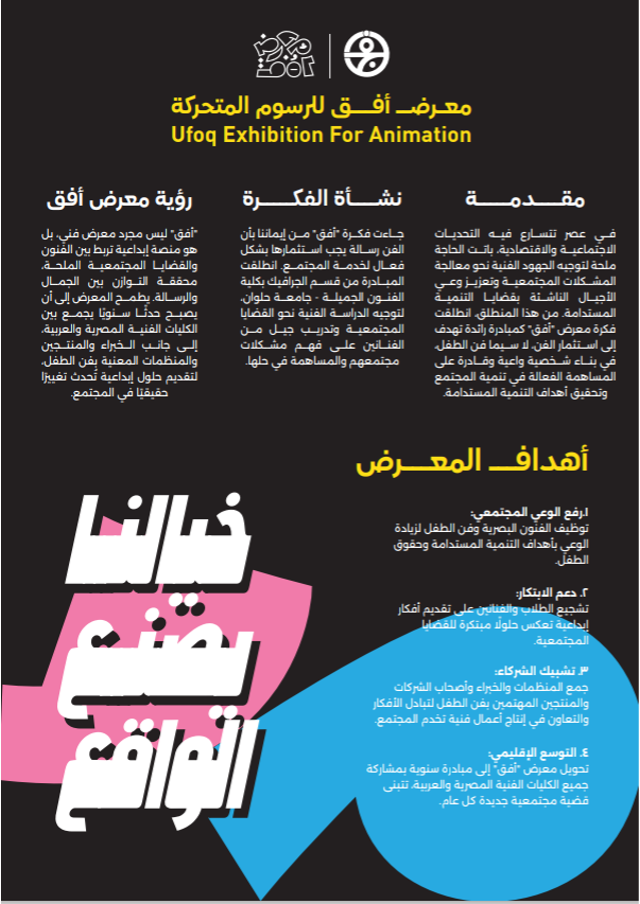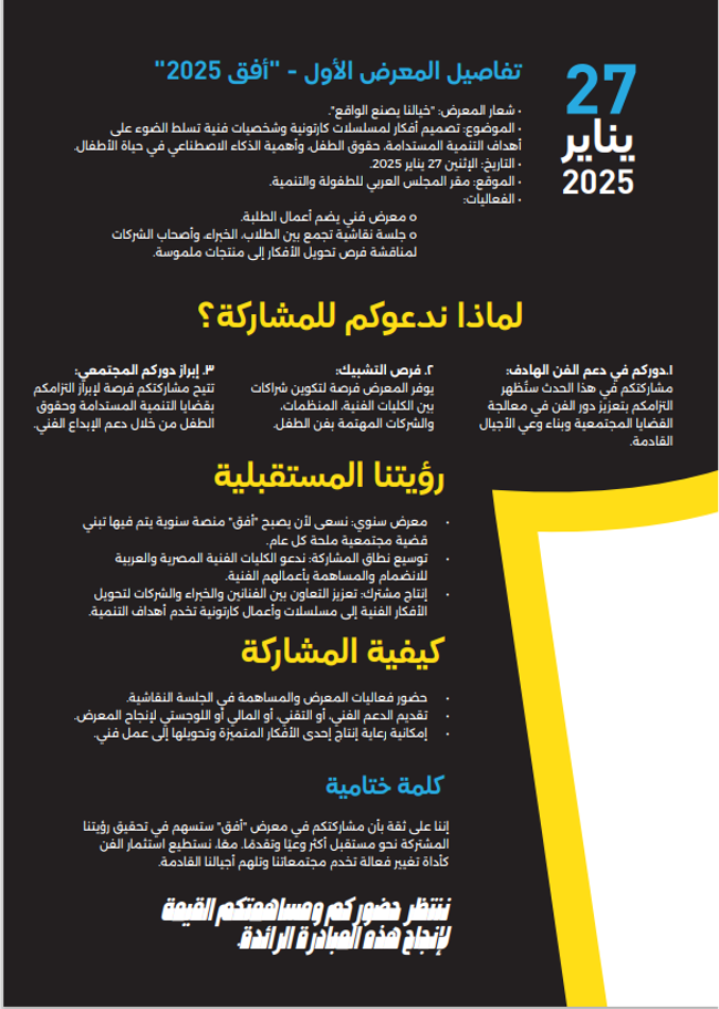 يقدم المعرض فرصة استثنائية لعرض أفكار مبتكرة لمسلسلات وتصميم شخصيات كارتونية، تهدف إلى توعية الأجيال القادمة بالقضايا المجتمعية المهمة وإلهامهم ليكونو جزءاً من التغيير الإيجابي.