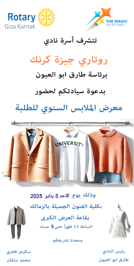 The Rotary Club of Giza Karnak organized a clothing sale exhibition at the faculty in the first week of January 2025. The proceeds from the sale were directed towards covering the tuition fees of students in need, under the supervision of the club's president, Mr. Tarek Abu Al-Eyon. The event was attended by professors: Maha Al-Sahn, Batoul Al-Zulfi, Hanan Al-Sallab, Lamiya Fawzi, and other club members.